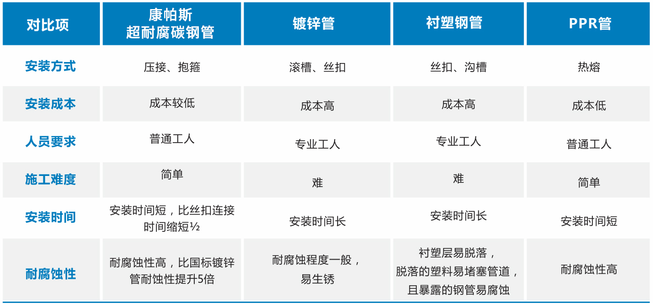 在實際應用中,康帕斯超耐腐碳鋼管與鍍鋅管、襯塑鋼管、PPR管的區别:(詳見右圖)